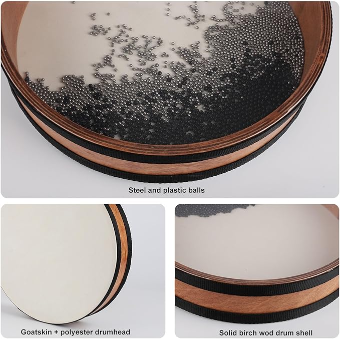- 【High Quality Ocean Drum】12 inch Ocean Drum made of sturdy birch wood shell.Built in lot of steel and plastic beads.Goatskin and transparent polyester drum skins, double sided drumhead design.Exquisite luxury, outstanding sound, size 12*12*2.4inch
