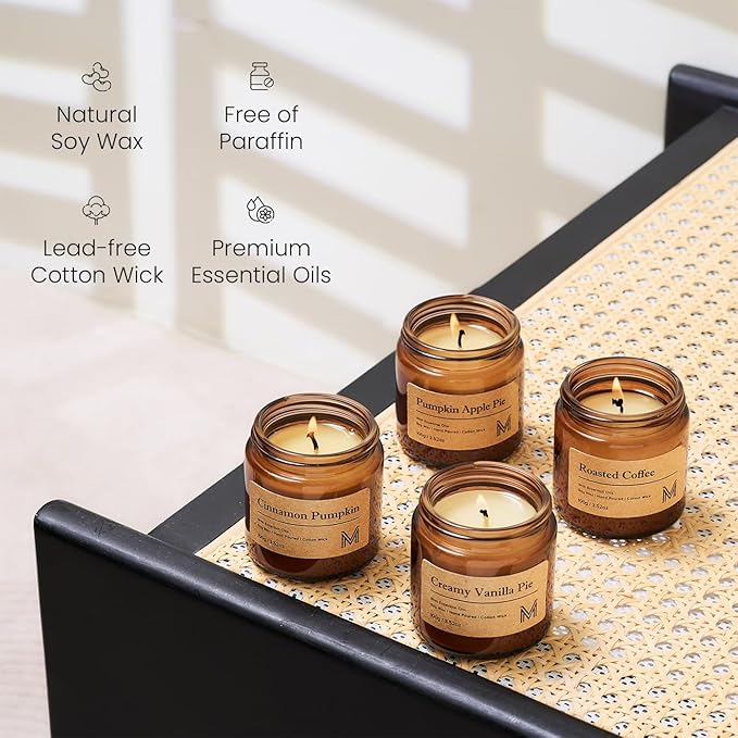- 【Candle Set】:Our candle set features four unique and captivating scents: from the warm aroma of Pumpkin Apple Pie to the rich fragrance of Cinnamon Pumpkin, from the smooth scent of Creamy Vanilla Pie to the robust aroma of Roasted Coffee. Whether you’re looking to create a cozy autumn atmosphere or enjoy a moment of rich coffee indulgence, this candle set has you covered. Each candle is crafted with a distinctive blend of scents to provide a complete sensory experience for both mind and body.