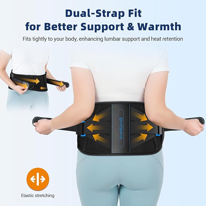 - Better Support and Heat Therapy: The dual elastic straps of this electric lower-back heating pad provide a snug, customized fit and fasten securely around the waist for both lumbar support and optimal heat retention. It includes an extension strap, making it adjustable for waist sizes from 26 to 52 inches (main belt: 47.2″ × 8.7″; extension: 23.6″ × 3.9″).