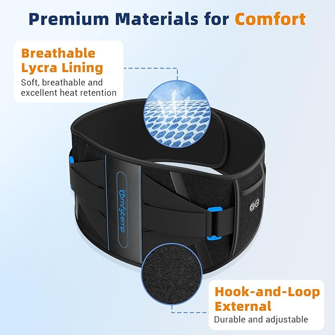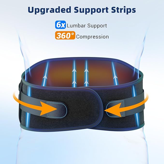 - Ergonomic Lumbar Support: The heated back brace adopts a new generation of ergonomic support system with 6 built-in support strips(4 lumbar + 2 abdomen)—offering targeted, zoned support and 360° balanced pressure distribution. The 26° arch-shaped bars replicate the spine's natural curvature for a more ergonomic fit. This design reduces pressure on muscles and intervertebral discs, helping relieve waist muscles ache, sciatica, lumbar strain etc.