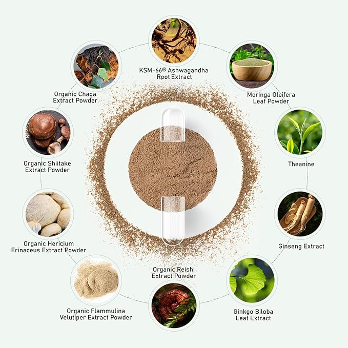KSM-66 Ashwagandha Supplements with L-Theanine Moringa Organic Mushrooms Complex Ginseng Ginkgo Biloba - Mood & Energy Support, Cortisol Manager, Immune Support, 60 Vegan Capsules