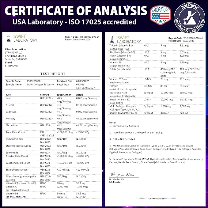 - THIRD-PARTY LAB TESTED in the USA – Our Biotin pills are rigorously tested by Swift Laboratory for purity and potency. Experience a 60-day supply bottle – 2 capsules a day, easy to swallow, suitable for Men and Women. GMO-free, Gluten-free, no binders, no fillers and free from harmful chemicals.