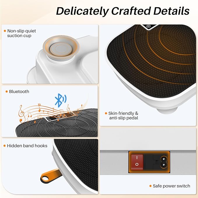 - 【Bluetooth Music & Comfortable Design】Stream music wirelessly via built-in Bluetooth speakers on this whole body vibration plate. Features skin-friendly pedals, anti-slip and quiet suction cups, and a 400-lb capacity—ideal for vibration plate workouts at any fitness level.