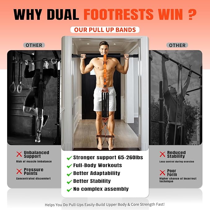 - 【Comfortable Two Feet Design】 Why settle for risky single-pedal Pull up bands? Our two feet pull up assistance band (pull up straps) distribute weight evenly, eliminating wobbles and slips during explosive lifts. The extra-wide, anti-slip pads cradle your feet comfortably, even during sweaty sessions, while the reinforced stitching handles up to 260lbs of force (heavy duty pull up assist band). No more shaky form or muscle strain, guaranteeing safe, stable pull up training every time!