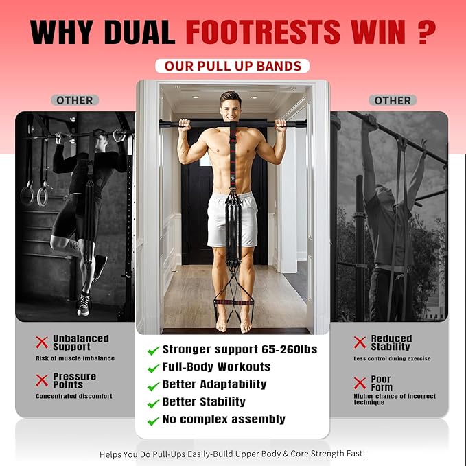 - 【Stable & Secure Pull-Up Assistance】 Our heavy-duty pull-up assist bands feature dual footrests (pull-up straps) for balanced weight distribution, eliminating wobbles and slips—even during explosive lifts! The anti-slip pads keep your feet locked in comfortably, while reinforced stitching supports up to 260lbs.Ideal for men and women, these assisted pull-up bands help you build raw strength while keeping workouts stable. They’re a must-have for your fitness equipment collection.