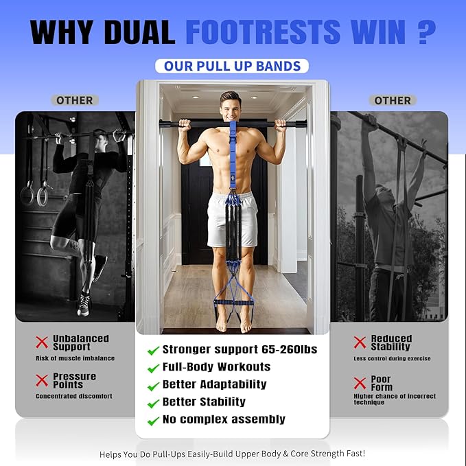 - 【Stable & Secure】 Tired of unstable single-pedal pull-up bands? Our heavy-duty pull-up assist band features dual pull-up straps with anti-slip pads for balanced support. The reinforced stitching ensures safety during explosive lifts, while the ergonomic design prevents wobbling and muscle strain.Perfect for strength training pull-up bars, these pull-up assistance bands heavy duty provide unmatched stability.