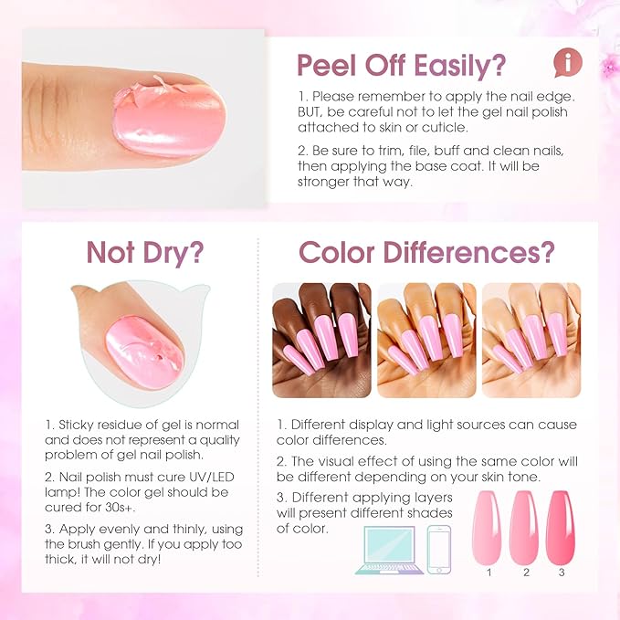 - PRO TIPS FOR BEST RESULTS: Prep is Key: Lightly buff nails before application to ensure lasting adhesion and prevent peeling. Deep Color Fix: Extend curing time to 180 seconds for rich, dark shades. Tingling Sensation? Briefly remove hand if needed, then resume curing comfortably