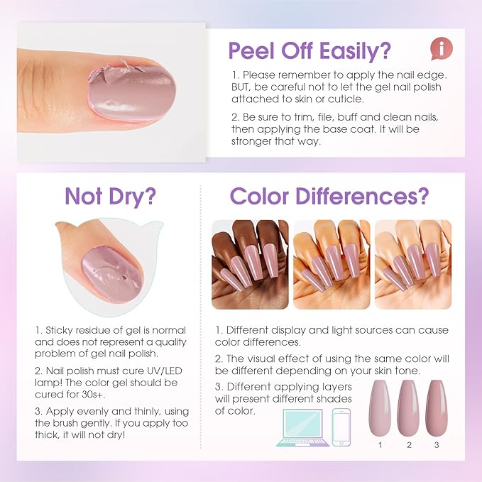 - PRO TIPS FOR BEST RESULTS: Prep is Key: Lightly buff nails before application to ensure lasting adhesion and prevent peeling. Deep Color Fix: Extend curing time to 180 seconds for rich, dark shades. Tingling Sensation? Briefly remove hand if needed, then resume curing comfortably