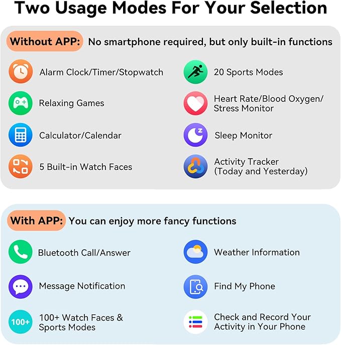 - No App or Phone Needed: Use this smartwatch straight out of the box—no app download or phone pairing required. Enjoy powerful features like all-day activity tracking, 20+ sports modes, heart rate/blood oxygen/sleep monitoring, alarms, and a calculator with simple settings. Perfect for hassle-free fitness tracking.