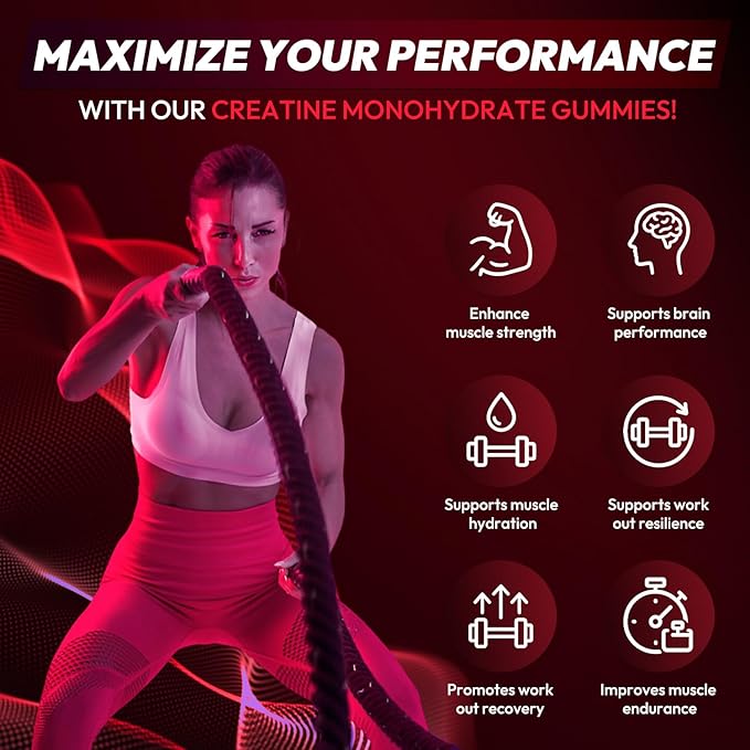 - HIGHLY ABSORBED CREATINE COMPLEX FOR POWERFUL BOOSTS: Experience the ultimate muscle building support with AEQNJV Creatine Monohydrate Gummies Complex, featuring a powerful 9,000 mg of creatine per serving. This advanced formula is fortified with L-Taurine and Vitamin B12 to ensure optimal energy, strength, and endurance. These gummies are designed to help you reach your peak performance, whether you're lifting, running, or recovering.