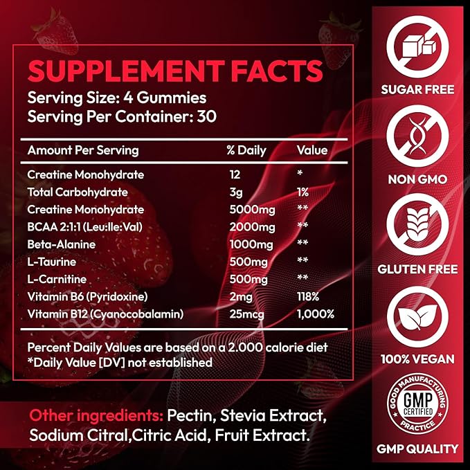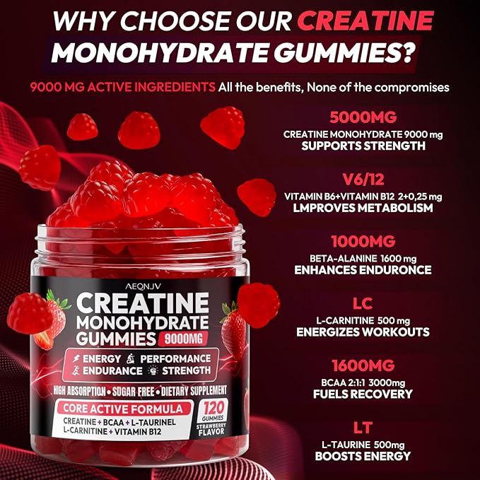 - COMPLEX FORMULA, BOOST EFFECTS: AEQNJV Creatine Gummies are packed with creatine, L-taurine, L-Carnitine, BCAA, vitamins B12 and B6. This potent combination not only enhances creatine absorption but also boosts strength and accelerates recovery. It also relieves muscle soreness, promotes rapid muscle growth, and improves endurance. It lets you work harder, recover faster, and build muscle like never before, far better than other creatine. It's the all-around sports energy supplement!