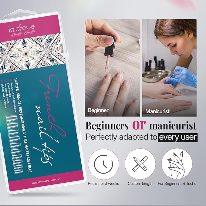 - THICKER FRONT & THINNER BACK:krofaue nail tips engineered with thicker front ends for durability and thinner backs for natural fit. The press on nails french slight curve adapts to most nail shapes, providing ultimate comfort that lasts 2-3 weeks. Say goodbye to uncomfortable tightness!