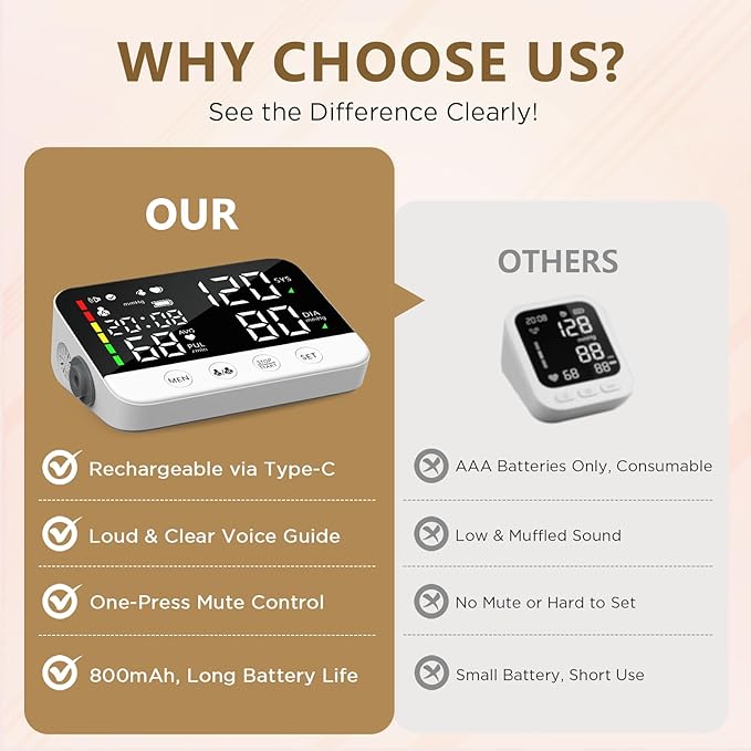- 【Never Buy Batteries & Large Capacity】This blood pressure cuffs for home use is charged via a USB-C port and has an increased battery capacity, allowing for more than 200 measurements per charge (full charge in 2-3hrs). Features adjustable voice prompts with one-touch mute via side button, which meet the needs of different people. Seniors appreciate the audible result announcements and reminders, while the voice toggle ensures universal accessibility.
