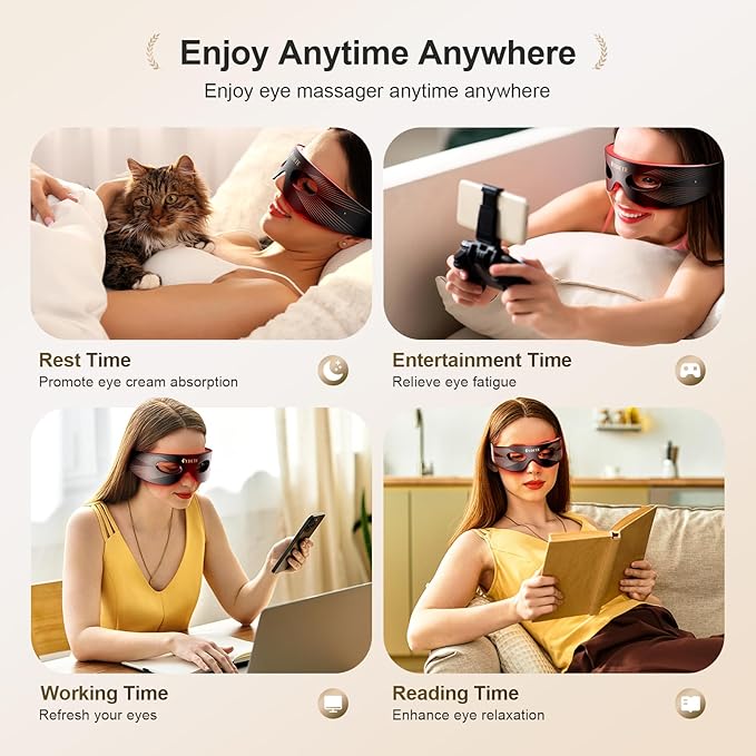 - 【Deep Light Technology】 Eye massager has lights of different colors, and light of different wavelengths can reach different depths of the skin, penetrate deep into the skin, and let dark circles and puffiness a thing of the past. The unique designed eye mask blocks light from entering your eyes, allowing you to multitask comfortably during your eyecare routine without straining your eyes.