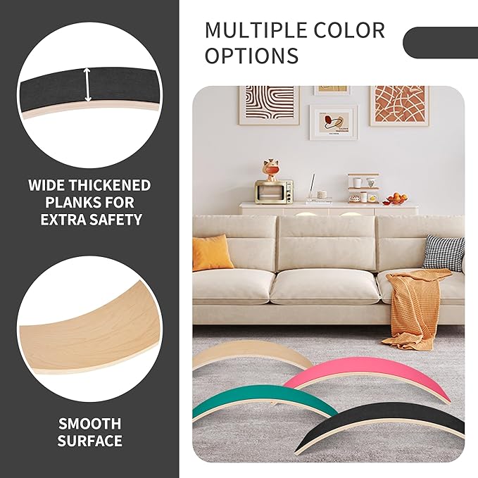 - Safe Design: Wobble Balance Board with a unique curved design that ensures stability and reduces the risk of slipping and injuries, providing a safe exercise experience for users. Its wide, thickened planks offer extra safety, and the smooth surface prevents scratches. Additionally, the anti-slip base protects your floor, and rounded corners further enhance safety, making it suitable for children and adults
