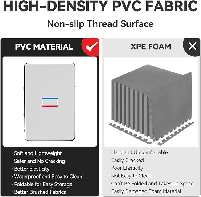 - Double-Thickened PVC Material: Wrestling mat inflatable is made of premium high-density PVC fabric, safe, waterproof and scratch-resistant. It has moderate hardness, with enough cushioning performance at the same time will not affect the flexibility of the athlete. It is not afraid of scratching, easy to clean, and very suitable for sports enthusiasts’ indoor or outdoor use