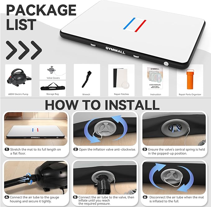 - Comprehensive Accessories Provided: The bjj mats for home include 1*600 W electric pump, 1*storage bag, 1*repair parts organizer, 1*valve cover, some repair patches, 1*wrench, 1*instruction. Different sizes and styles meet everyone's personalized preferences and needs, providing sports enthusiasts with a comfortable and secure sports environment