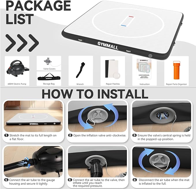 - Comprehensive Accessories Provided: The bjj mats for home include 1*600 W electric pump, 1*storage bag, 1*repair parts organizer, 1*valve cover, some repair patches, 1*wrench, 1*instruction. Different sizes and styles meet everyone's personalized preferences and needs, providing sports enthusiasts with a comfortable and secure sports environment