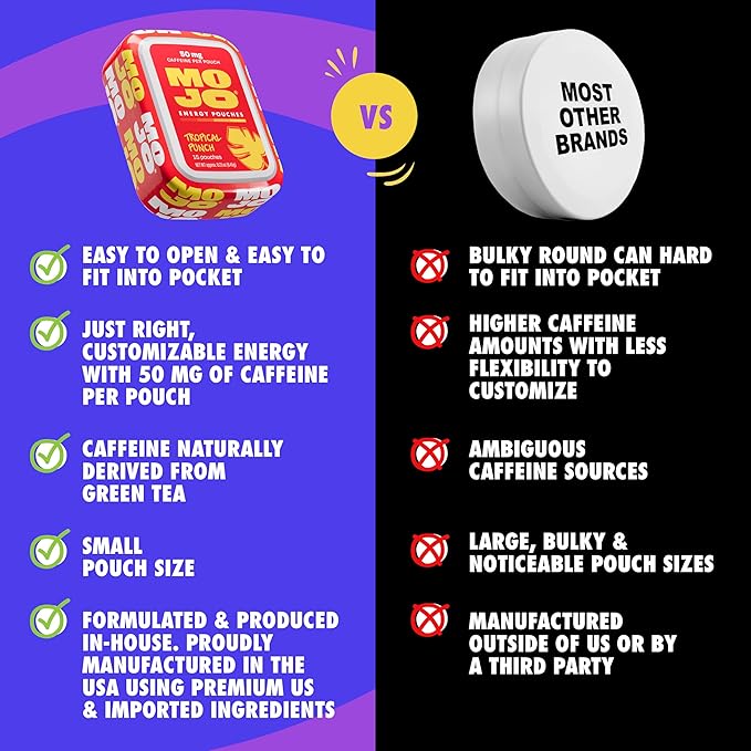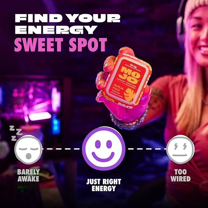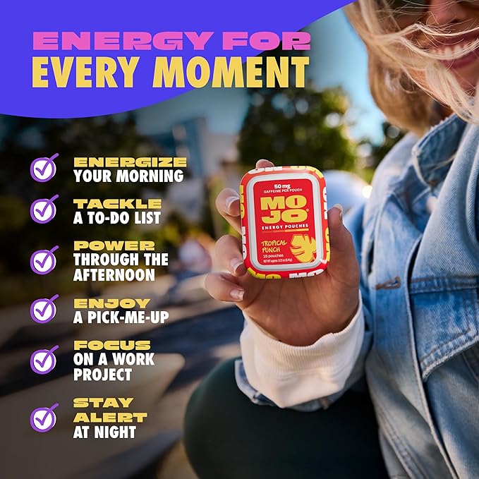 - CONVENIENT & EASY TO USE: Powders spill. Coffee takes time. Energy drinks weigh you down. Meet Mojo Energy Pouches – the newest and easiest way to energize! Simply place a caffeine pouch (or pouches) anywhere in your mouth. Enjoy for about 20 minutes while the caffeine is absorbed into the lining of your mouth then toss away and crush your day!