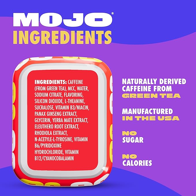 - CAFFEINE BY THE POUCH: Mojo Energy Pouches are a new way to customize and control your energy. Each pouch contains 50mg of caffeine naturally derived from green tea, B vitamins (B3, B6, B12), ginseng, yerba mate, and l-theanine with 0 sugar and 0 calories, making it perfect for buildable caffeine to get your energy levels right when powering through mornings, afternoon slumps, never-ending to-do lists, and any other moments when you need extra energy.