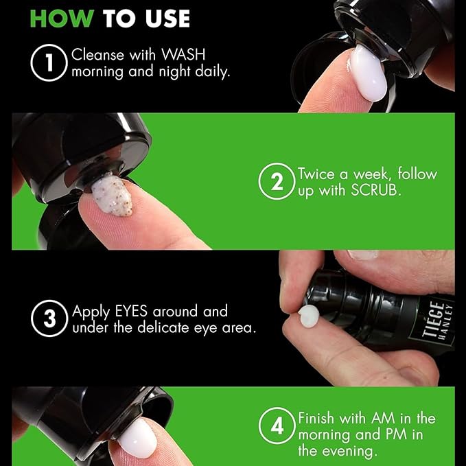 - Advanced Skin Care Essentials: WASH rinses away oil and dirt to help keep sebum production under control. Exfoliating SCRUB promotes skin cell growth and helps even out your skin tone (use just 2x a week). AM is a morning facial moisturizer with SPF 20, while PM is a bedtime moisturizer used to help diminish wrinkles while you sleep.