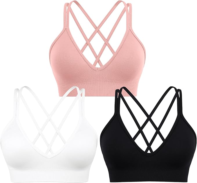 Sports Bra for Women V-Neck Strappy Criss Cross Yoga Bra Padded Medium Support Workout Gym Athletic Fitness Bras 3 Pack