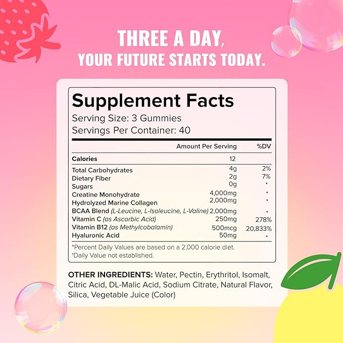 - FOR HER STRENGTH: Creatine Monohydrate for women is scientifically formulated to enhance performance, strength, and endurance during resistance training. With each serving, you’ll increase strength and power output. Our formula combines pure Creatine Monohydrate with BCAAs and Collagen to support lean muscle development and glute definition. Whether you're hitting the gym, doing yoga, or staying active throughout the day, our creatine women gummies help boost performance and faster recovery
