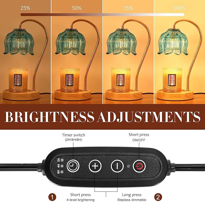 - 【Adjustable Brightness & Temperature】Featuring four dimmable settings, allowing for precise adjustment of the wax melting speed.Adjusting to a higher brightness setting accelerates the release of fragrances. Package includes two 50W bulbs.(Candles not included.)
