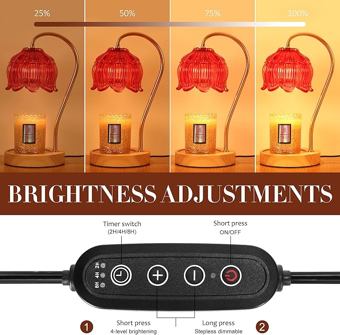 - 【Adjustable Brightness & Temperature】Featuring four dimmable settings, allowing for precise adjustment of the wax melting speed.Adjusting to a higher brightness setting accelerates the release of fragrances. Package includes two 50W bulbs.(Candles not included.)
