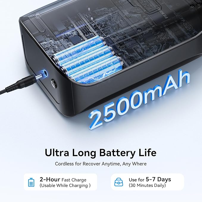 - Ultra Lang Battery Life - Cordless and Rechargeable design frees you from the constraints of power cords. Built-in 2500mAh large capacity battery can last up to 5-7 days (30-minute daily use ) on a full charge. It comes with a premium carrying bag, you can enjoy the rapid recovery provided by this system at the outdoors, trainings, sports grounds, gyms, etc
