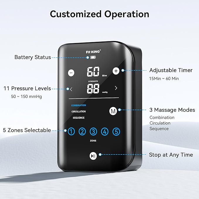 - 5 Overlapping Air Chambers - Compared to previous versions, this model has upgraded from 4 to 5 air chambers (foot, lower calf, upper calf, lower thigh, and upper thigh). 5 overlapping air chambers can 360° wrap your full legs, even the zone at the junction of the airbags can be massaged. Sensor system will precise control the inflation volume according to the different sizes of legs, which can provide you the most suitable and safe air pressure to prevent the danger of excessive contraction.