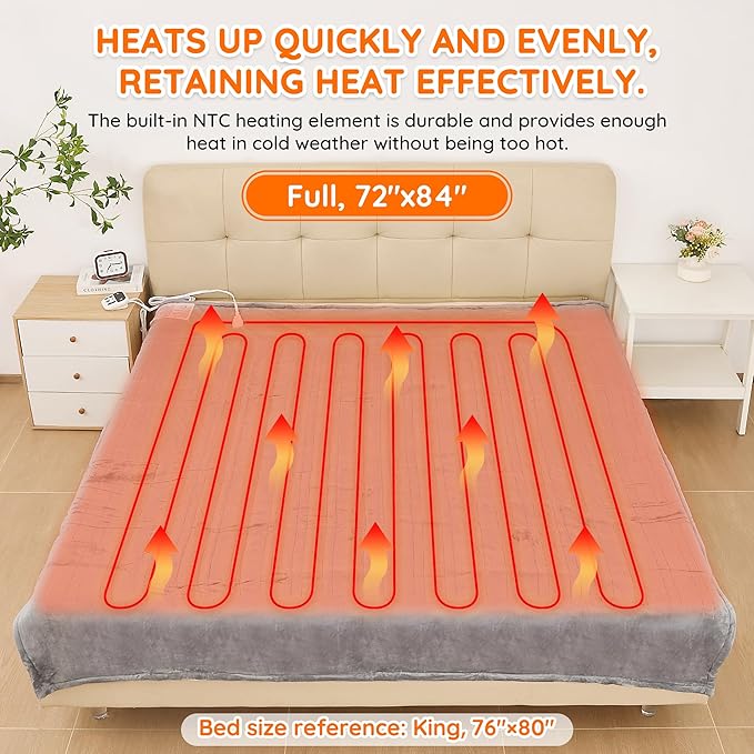 - 1️⃣ [Intelligent Dual-Wire System, Fast and Even Heating] This electric blanket full features high-quality PTC and NTC heating wires, which heat up quickly and evenly in just 3 minutes, keeping you warm from head to toe. The PTC heating wire increases resistance as temperature rises, safely limiting heat flow. This allows your electric blankets to maintain your selected temperature all night long without overheating or sudden drops in temperature. This helps improve your sleep quality and ensure a comfortable winter.