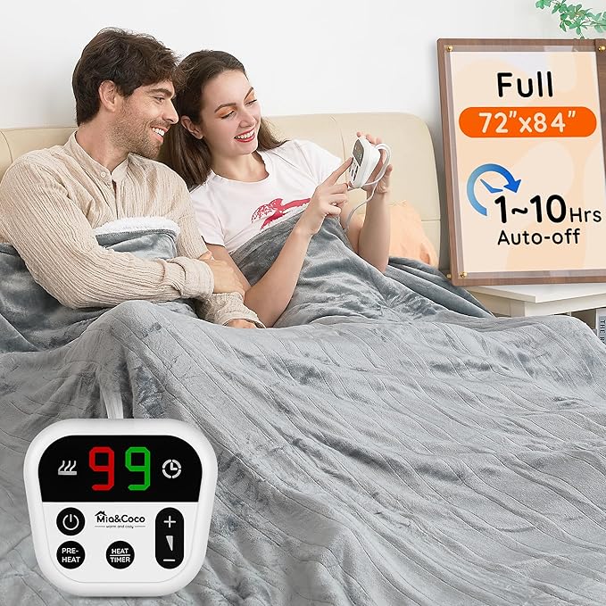 Mia&Coco Heated Blanket Full Size -72"x84" Flannel Electric Blanket,10 Heat Levels, 10-Hour Auto-Off,Fast Heating,Overheat Protection,Machine Washable, Soft Heating Blanket for Home and Office (Gray)