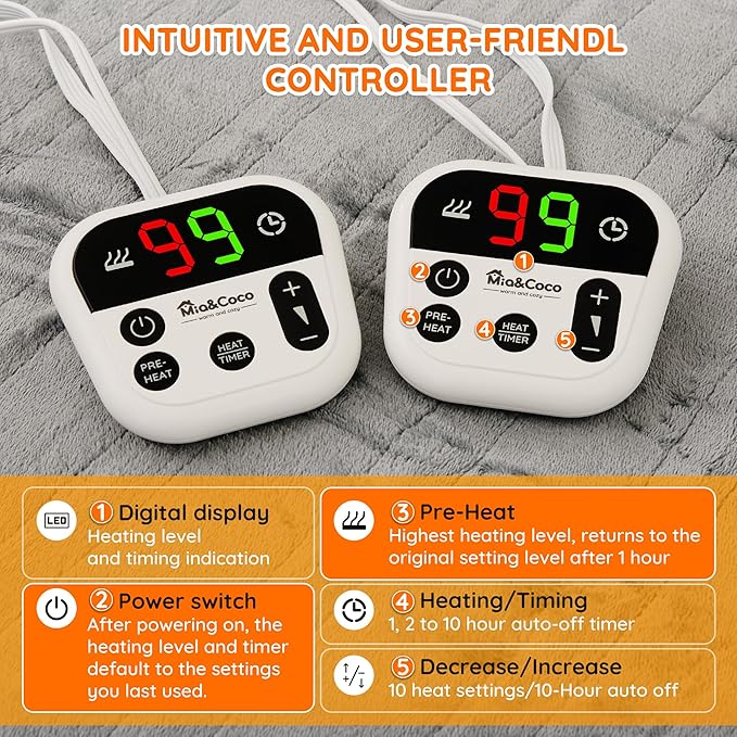 - 4️⃣ [Safe, Reliable, Ergonomic Controller with Clear LED Display] This queen heated blanket uses a new, round controller that's comfortable to hold. The buttons are well-spaced and slightly recessed to prevent accidental touches, ensuring peace of mind. The LED display features red digits indicating the temperature level and green digits indicating the timer. The larger digits are easy to read, day or night.