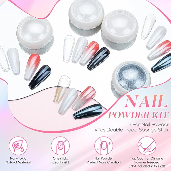 - Package Included: 4 Jars Nail Powder with 4 pcs eyeshadow sticks. You can get pearl iridescent effect when you apply over the light color base gel. And, get aurora chrome effect when you apply over black/dark base gel.
