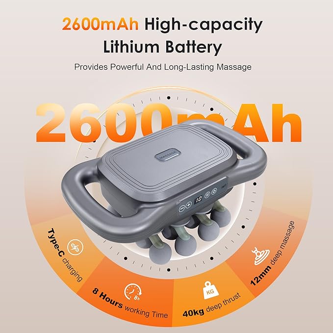 - 【Long-Lasting & Ultra-Quiet】Equipped with a 2600mAh battery and Type-C fast charging, the battery takes about 3 hours to fully charge and can be used for up to 8 hours. The indicator light flashes during charging and stays on when fully charged. We have built-in protection devices that cannot be used while charging. Operating at just 35-45dB, it is one of the quietest body massagers for muscles, perfect for home, gym, or office use.