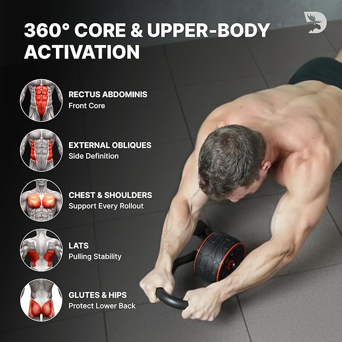 - 360° CORE ENGAGEMENT: Unlock the full potential of your core with the DMoose Ab Wheel Roller. Its 360° design targets your abs and obliques for maximum strength, definition and muscle engagement in every move, giving you faster, more noticeable results.