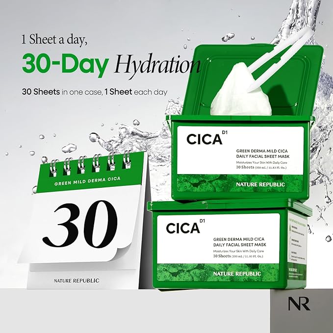 Nature Republic Cica Daily Face Mask (30 vegan sheets) Propolis Extract & Centella Asiatica Bulk Facial spa Mask for Moisturizing & Hydrating Glow, korean beauty skin care for all skin types