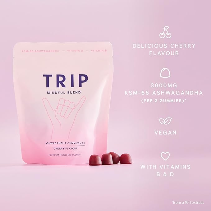 - VEGAN & NATURALLY FLAVOURED: Made with plant-based ingredients, TRIP Cherry ashwagandha gummies for women and men are vegan-friendly and crafted without artificial colors or flavors.