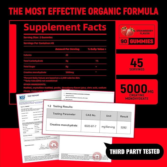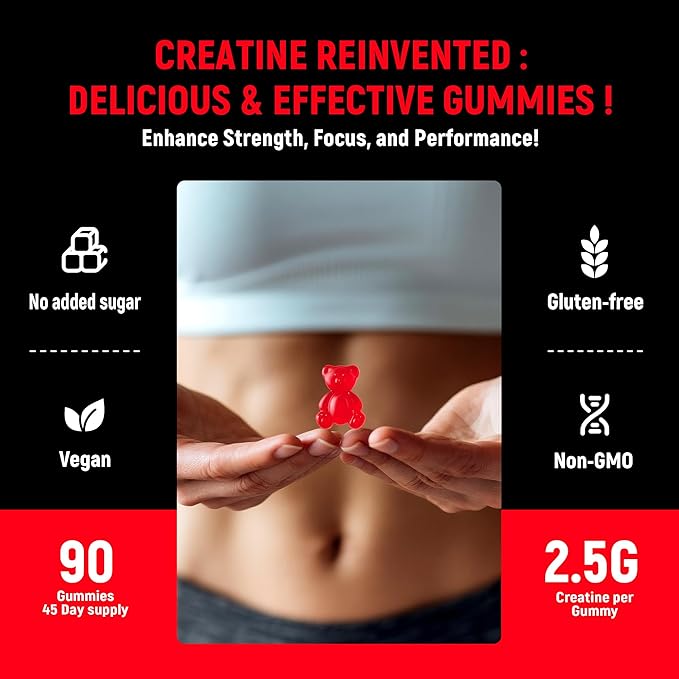- CONVENIENT & DELICIOUS: Say goodbye to messy powders and bland supplements. Our refreshing Strawberry flavor makes every gummy an indulgence. With 2.5g creatine per gummy, enjoy ultimate convenience and performance benefits in every bite.