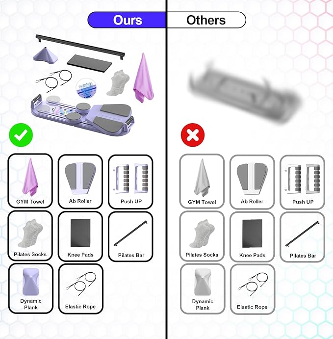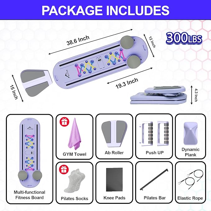 - ๐ [Compact Kit, Total Transformation, Everything Included] ๐ Unlike basic kits, ours includes everything you need to sculpt, strengthen, and flow: a Pilates board, bar, multi-handles, thickened resistance bands, ab balance board, dynamic plank column, and knee pad, plus free non-slip Pilates socks and a premium gym towel. Built to last with durable, thickened materials, this set unlocks 15+ exercises for studio-quality workouts at home.