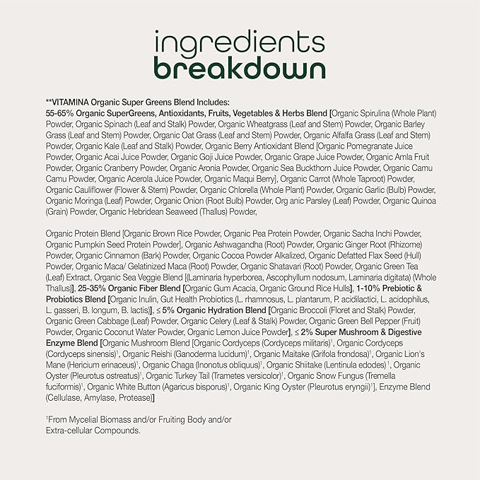 - Organic Supergreens Blend in Capsules: Each daily serving provides over 70 organic superfood ingredients, including 3g of dietary fiber, to support overall wellness. Our blend features nutrient-dense greens, fruits, and vegetables plus herbs, a powerful mushroom complex, and added prebiotics, probiotics, and digestive enzymes for comprehensive nutrition.