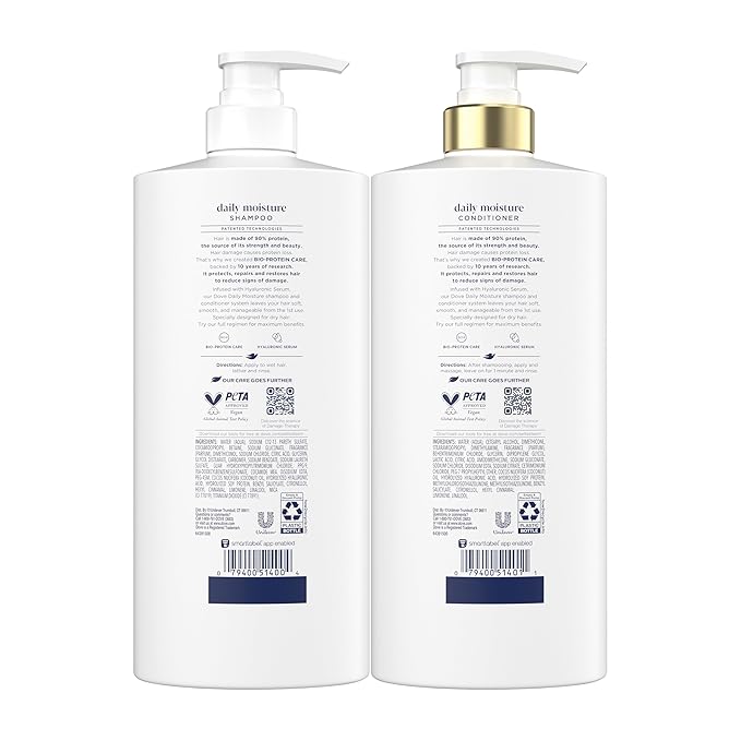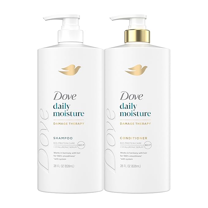- This Dove Hair Care Regimen Pack includes Dove Damage Therapy Shampoo for Dry Hair Daily Moisture with Bio-Protein Care Technology and Hyaluronic Serum (28 Fl Oz) and Dove Conditioner for Dry Hair Daily Moisture with Bio-Protein Care Technology and Hyaluronic Serum (28 Fl Oz).