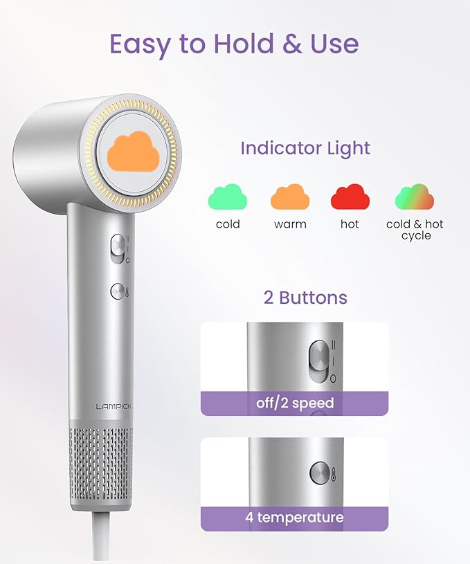 - 【Multiple Heat and Speed Settings】LAMPICK professional hair dryer is equipped with 4 Temps(Cold/Warm/Hot/Hot and Cold Air Cycle Mode,) & 2 Speeds settings (Gentle/Fast). This portable hairdryer allows you to customize the drying process to your hair type and styling needs. For example, lower heat settings are ideal for fine or damaged hair, while higher heat settings work well for thick or coarse hair.
