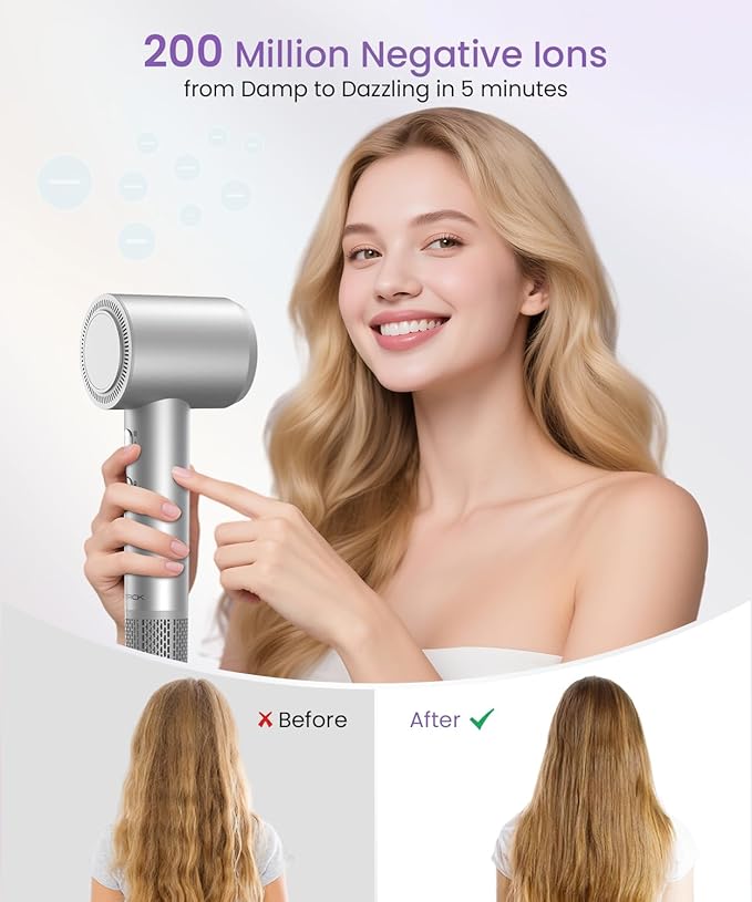 - 【Powerful Airflow Dries Hair Quickly】 This high-speed hair dryer features a high wattage and 110,000 RPM motor, providing powerful airflow with a wind speed of 25m/s. 6X drying times faster than traditional hairdryers, this time-saving blow dryer cuts drying time in half and delivers salon-quality results at home.