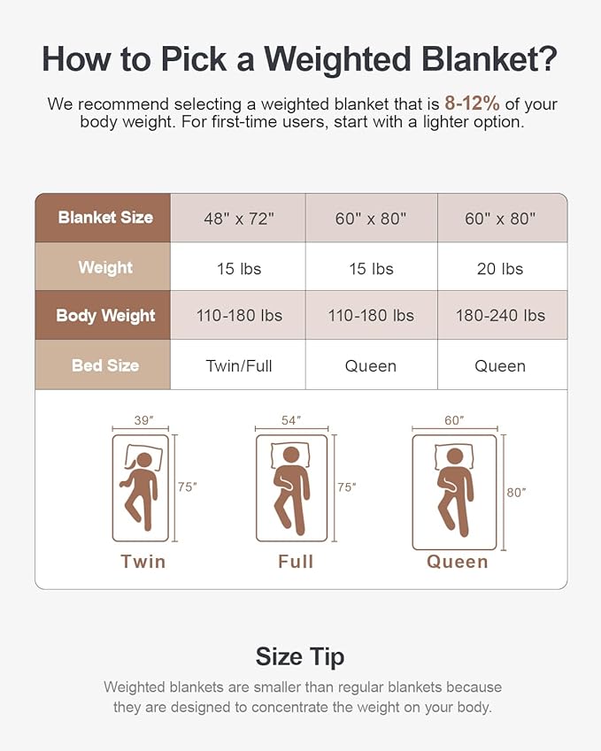 - Weight & Size Guide: We recommend choosing a weighted blanket 8%-12% of your body weight. For first-time users, start with a lighter option. PLEASE NOTE that weighted blankets are smaller than regular ones, fitting just the mattress to prevent slipping off the bed