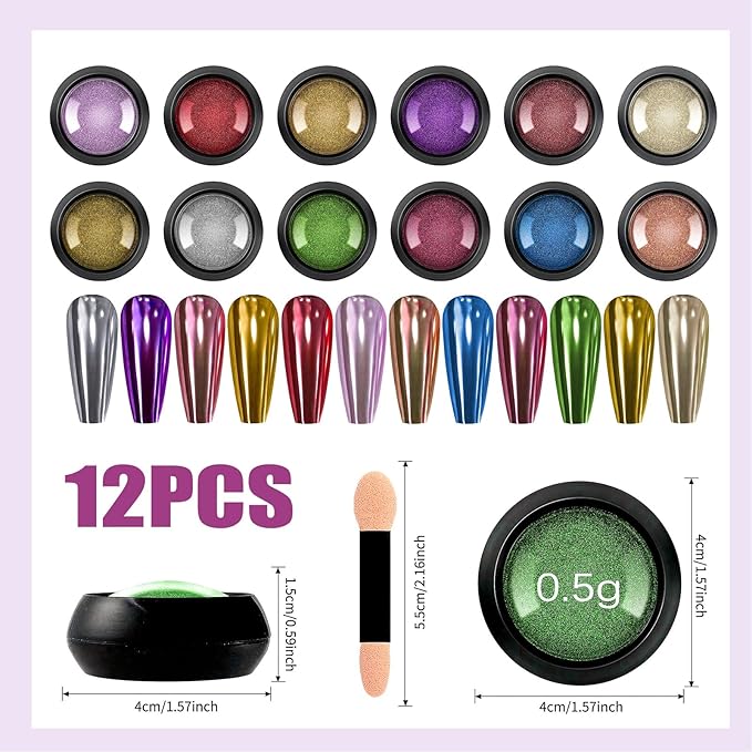 - What You Will Receive: You will get 12 boxes of chrome nail powder, including purple, silver, green, blue, pink, red, brown and other colors. Each box is 1 gram, which is convenient to carry and store. You will also get 12 double-ended sponge sticks for applying powder.