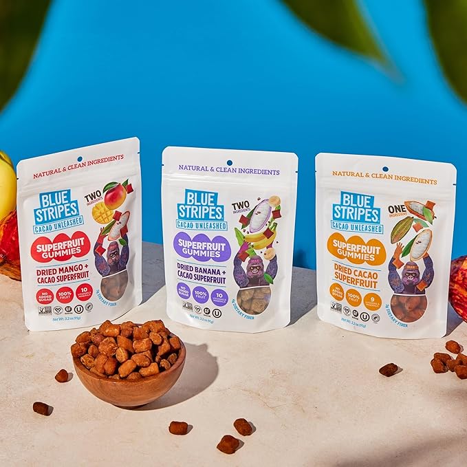 Blue Stripes Cacao Superfruit Gummies - Vegan Chewy Fruity Snack, No Sugar Added 100% Fruit Gummy, 9 Essential Vitamins & Minerals, Natural Tropical Superfood - Pineapple & Cacao, 3.2 oz (4 Pack)