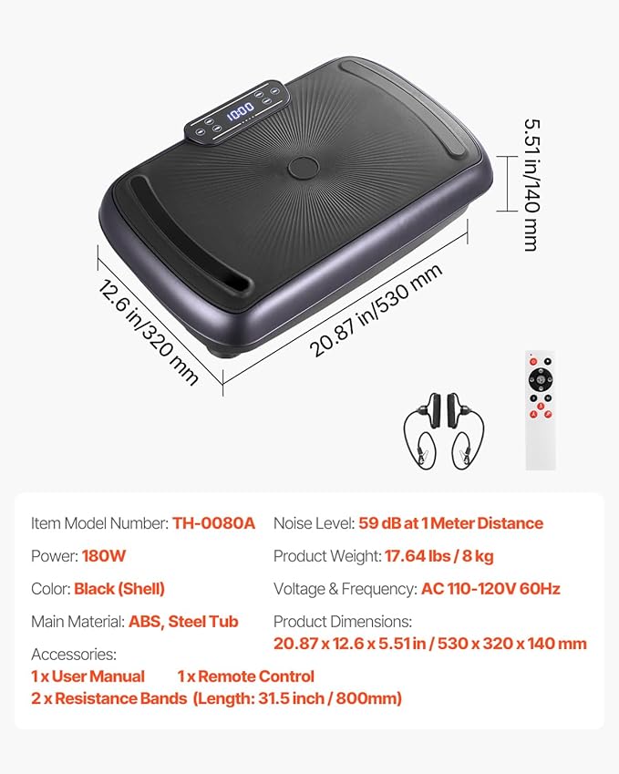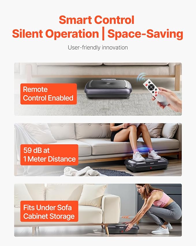 - User-Friendly Design: The vibrating plate supports remote control, with a low noise level of only 59 dB (at 1-meter distance), so it won’t disturb your family. The compact body can be easily stored under a sofa or cabinet, saving space