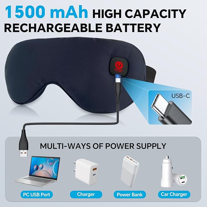 - 【Cordless & Rechargeable Design】Say goodbye to tangled wires. Our cordless eye mask features a 1500mAh rechargeable battery, supporting 4–6 sessions per full charge. With versatile Type-C charging, it’s perfect for travel, office naps, or bedtime relaxation without restrictive cords.